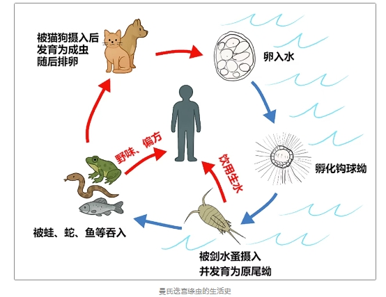 曼氏裂頭蚴的生命周期涉及多個宿主。成蟲主要寄生在貓、狗等動物腸道,產(chǎn)下的蟲卵隨糞便入水后孵化為幼蟲(鉤球蚴);幼蟲被水蚤吞食后在其體內(nèi)發(fā)育成原尾蚴;當青蛙、魚或蛇攝入受感染的水蚤,原尾蚴在它們體內(nèi)進一步發(fā)育成裂頭蚴;貓、狗等再食入攜帶裂頭蚴的蛙、魚或蛇,裂頭蚴便會在這些動物的腸道內(nèi)發(fā)育為成蟲,完成整個生命周期。