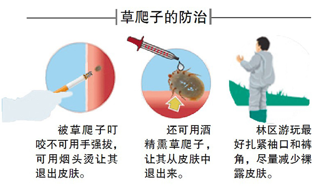 醫(yī)生提醒,為防止草爬子咬傷,市民到草叢、山林等地游玩后要及時檢查身體四肢、關(guān)節(jié)處等,如感覺皮下疼痛并有米粒大黑點要及時就醫(yī)。即使草爬子不帶病毒,不及時將其清出也會引起皮膚紅腫。